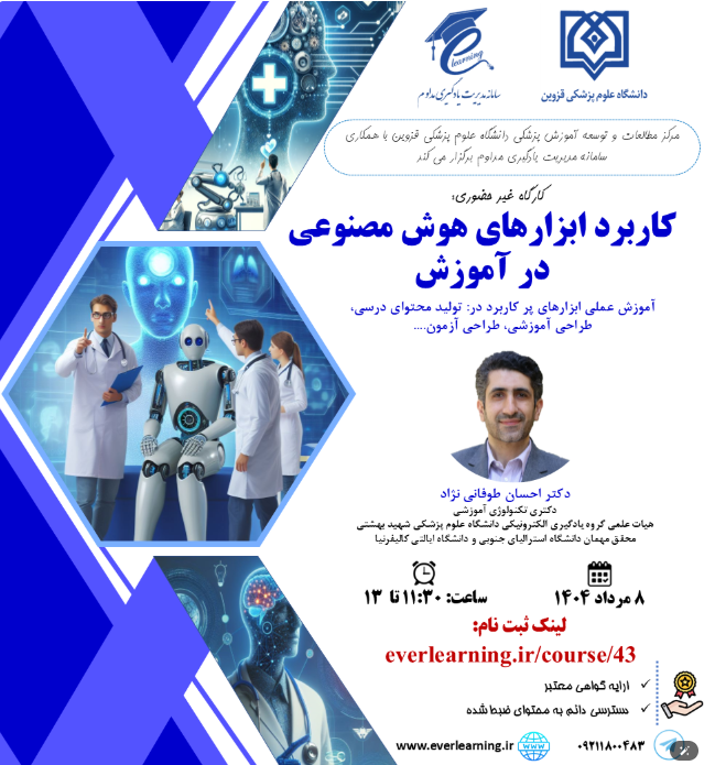 دانشگاه علوم پزشکی قزوین با همکاری سامانه مدیریت یادگیری مداوم وبینار "کاربرد ابزار های هوش مصنوعی در آموزش"  را در چهارشنبه 8 مرداد 1404 از ساعت 11:30 الی 13 به صورت آنلاین برگزار می نماید.